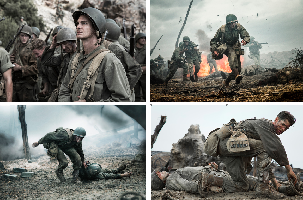 종교적 이유로 양심 선언을 해 총을 소지하거나 쏘지 않겠다고 맹세를 하였기에 그는 의무병으로 전투에 참여하게 됩니다. 일본군과의 전투에서도 목숨을 걸고 동료와 상사를 구하는 이야기를 긴장감 넘치고 사실적으로 그려내었고 그가 처음으로 총을 들게된 이유도 부상당한 상사를 절벽밑으로 나르기 위해 묶기 위한 수단으로 사용하였던 장면은 정말 인상적이었습니다.