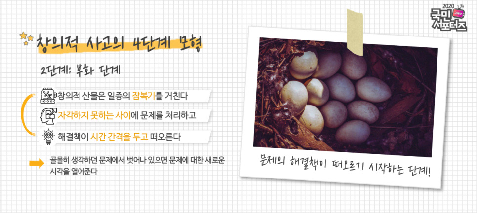 부화 단계라고 하겠습니다. 창의적 산물은 일종의 잠복기를 거칩니다. 자각하지 못하는 사이에 문제를 처리하고 해결책이 시간 간격을 두고 떠오르게 됩니다. 골몰히 생각하던 문제에서 벗어나 있으면 문제에 대한 새로운 시각을 열어줍니다.