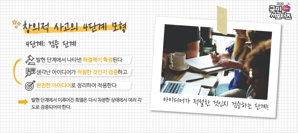 4단계는 검증의 단계입니다. 발현 단계에서 나타낸 해결책이 확정됩니다. 생각난 아이디어가 적절한 것인지 검증하고 완전한 아이디어로 정리하여 적용합니다.