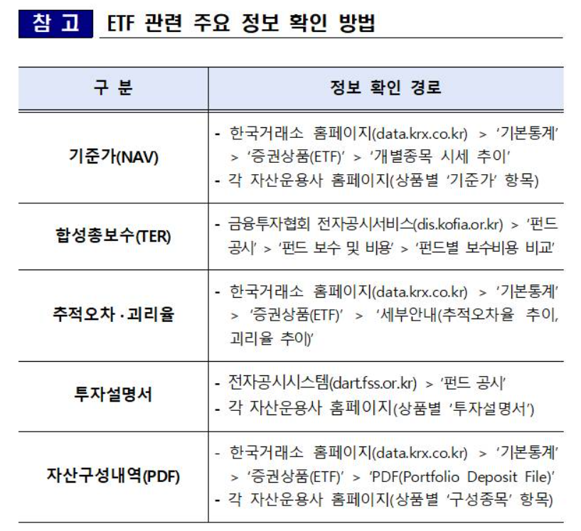 이외에도 실시간 공시되는 ETF의 자산구성내역을 통해 편입종목·투자비중 등을 확인해야 하며 유튜브 등 SNS에서 핀플루언서(금융+인플루언서) ETF 추천영상이나 추천글을 맹신해선 안 된다고 당부했습니다.